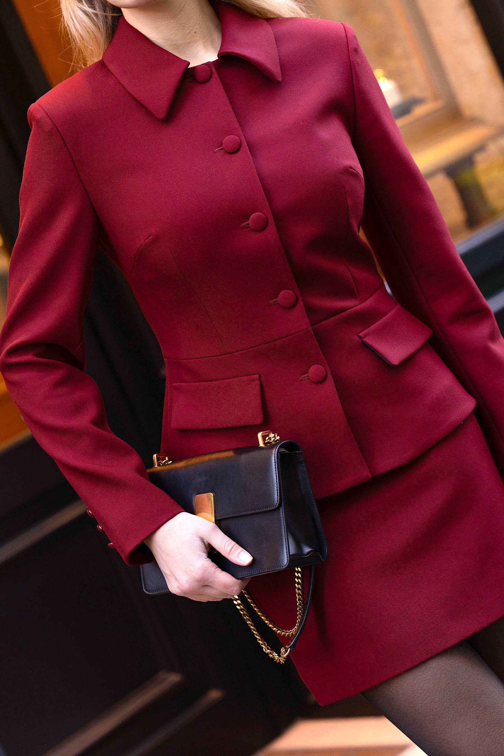 This jacket is created from a premium upcycled wool blend and is fully lined. It features a structured silhouette with a defined waist, long sleeves, a high neckline, and a shirt-style collar. The design is completed with faux flap pockets, a button-down front, and tonal fabric-covered buttons.