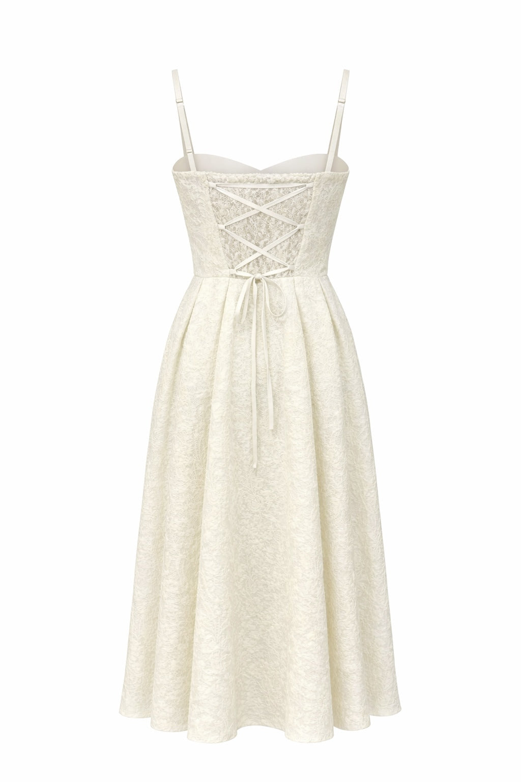This dress is crafted from a premium blend of upcycled acetate and cupro with a viscose lining. It features a boned corset-style bodice, an elasticated back, adjustable shoulder laces, and a full lace overlay.