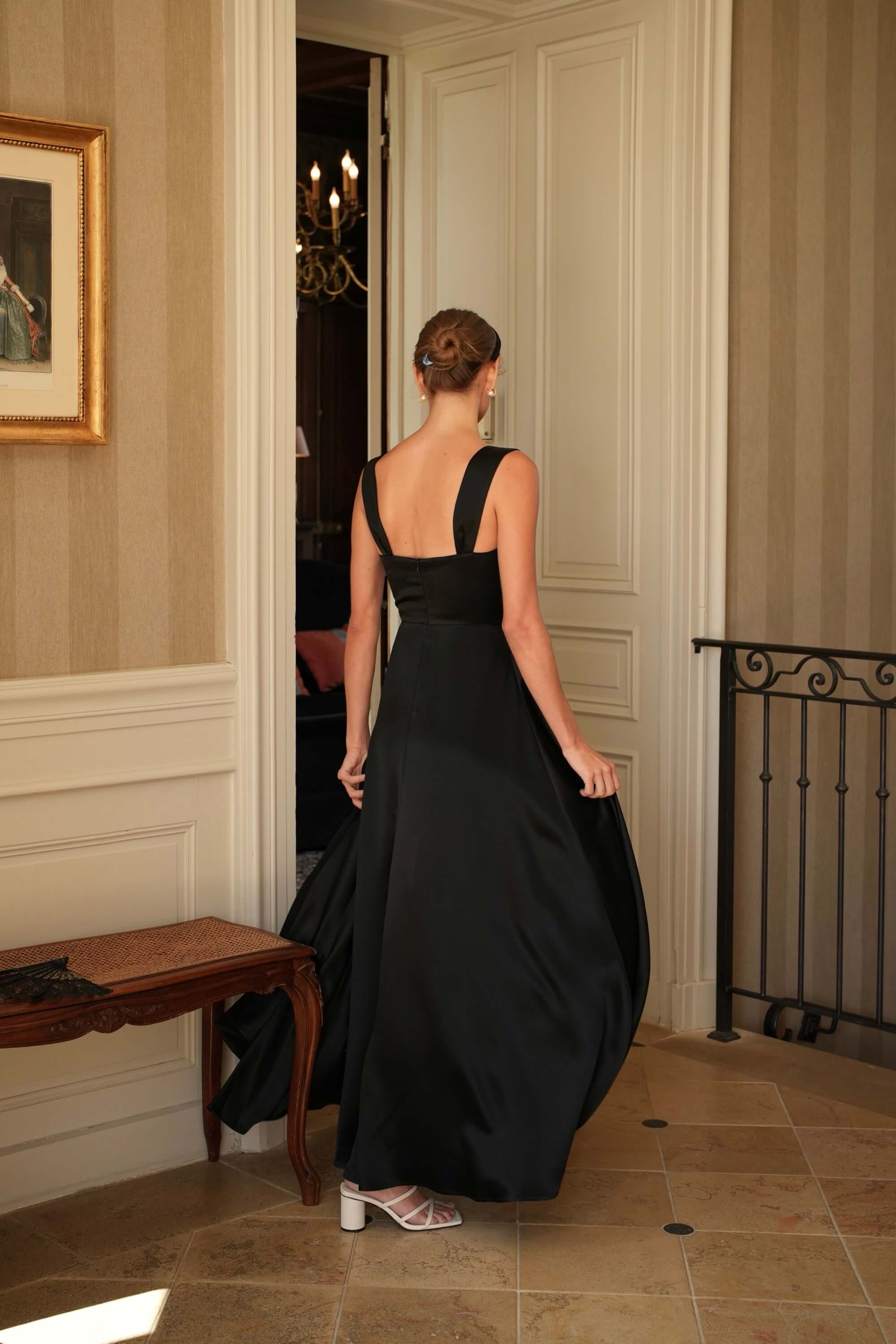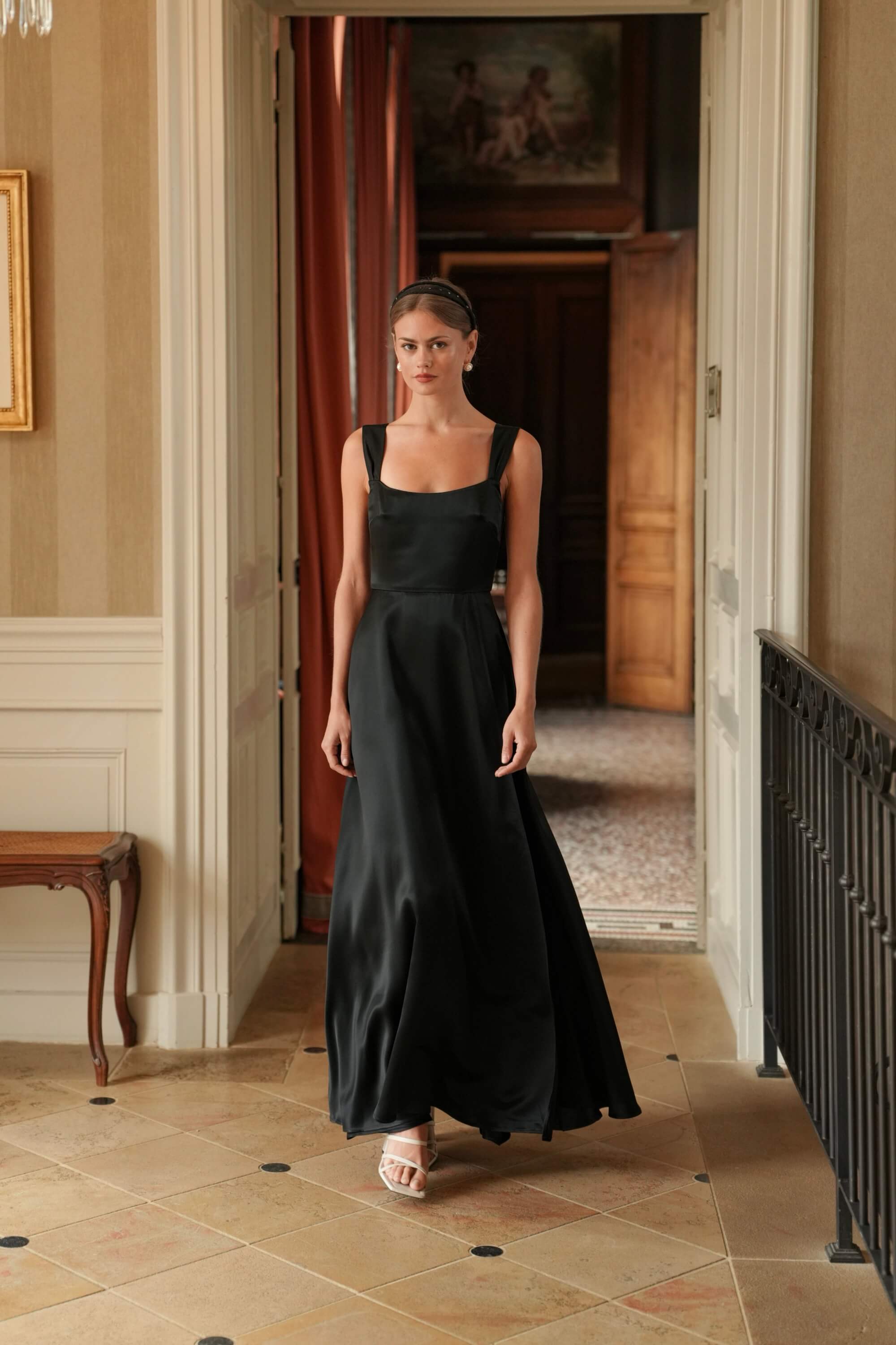 The Suzanne Maxi Dress features a square neckline with folded straps, a tailored waist, a full skirt with a graceful overlay, and a concealed side zipper for a seamless fit.
