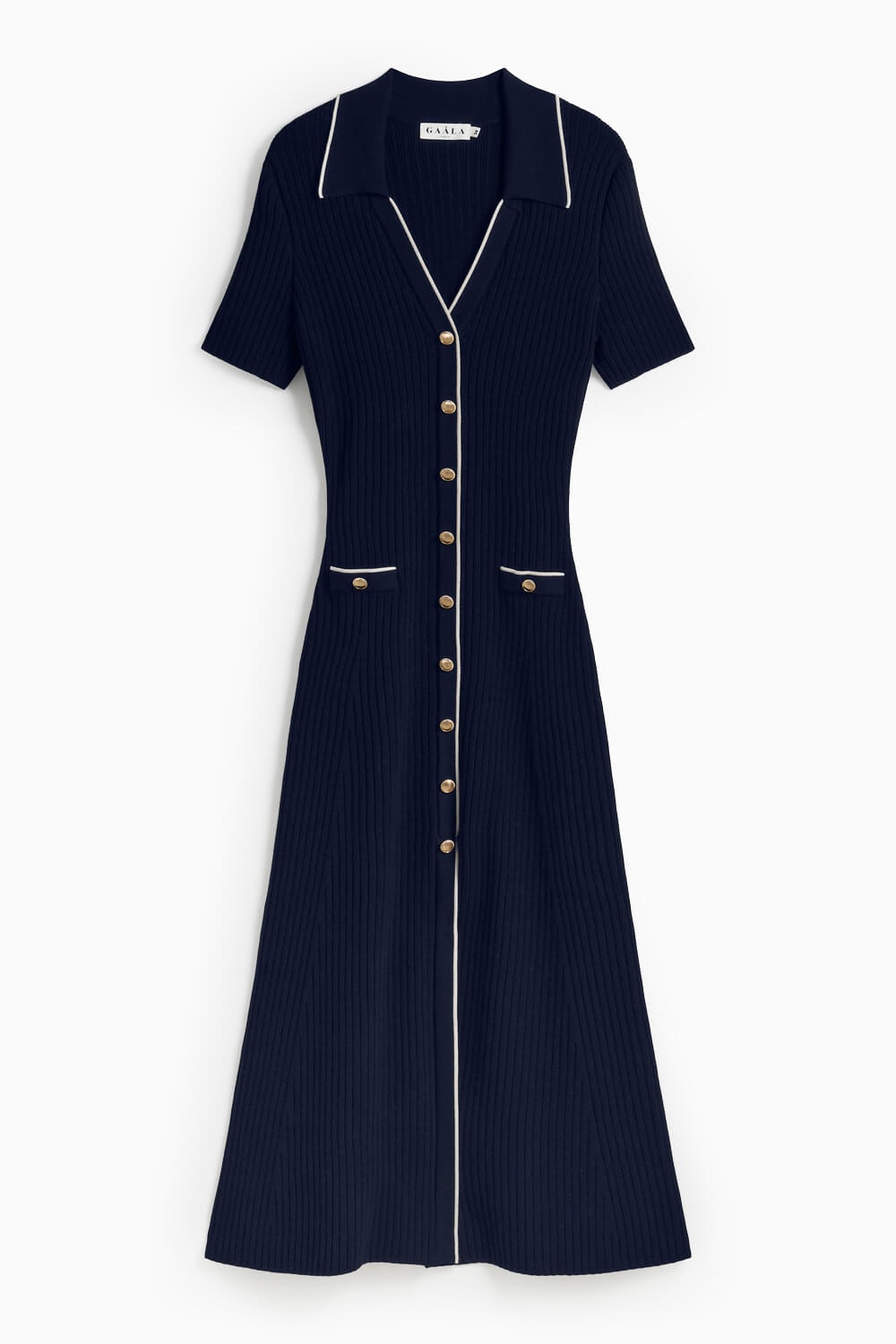 Crafted from sustainable Lenzing™ Ecovero with a luxurious stretch, this collared v-neck dress features short sleeves, an aesthetic faux button-down front and pocketing, a front slit, and woven piping for an elevated feel.