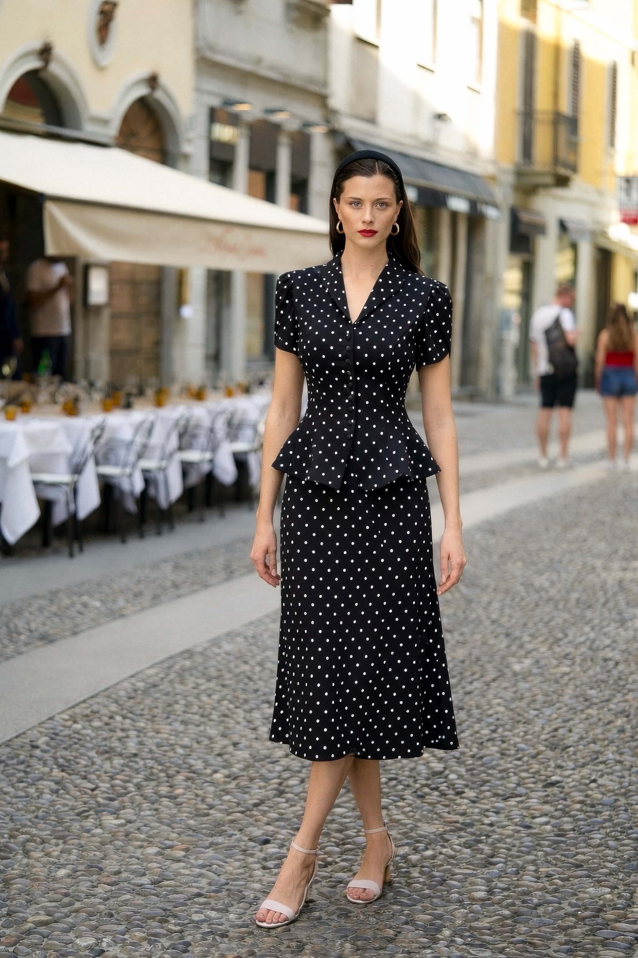 Crafted from premium upcycled rayon and fully lined, this blouse features a notched lapel collar and a button-down front. The short petal-shaped puff sleeves are finished with overlapping detailing and gathering at the sleeve head. Vertical relief seams shape the hourglass silhouette, while a slight peplum flare falls below the waistline.