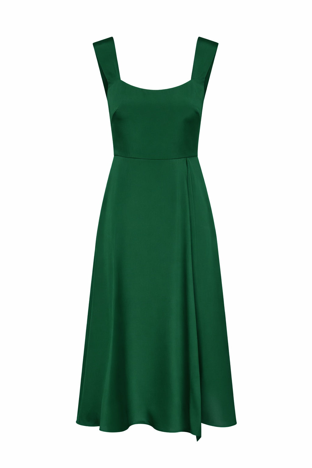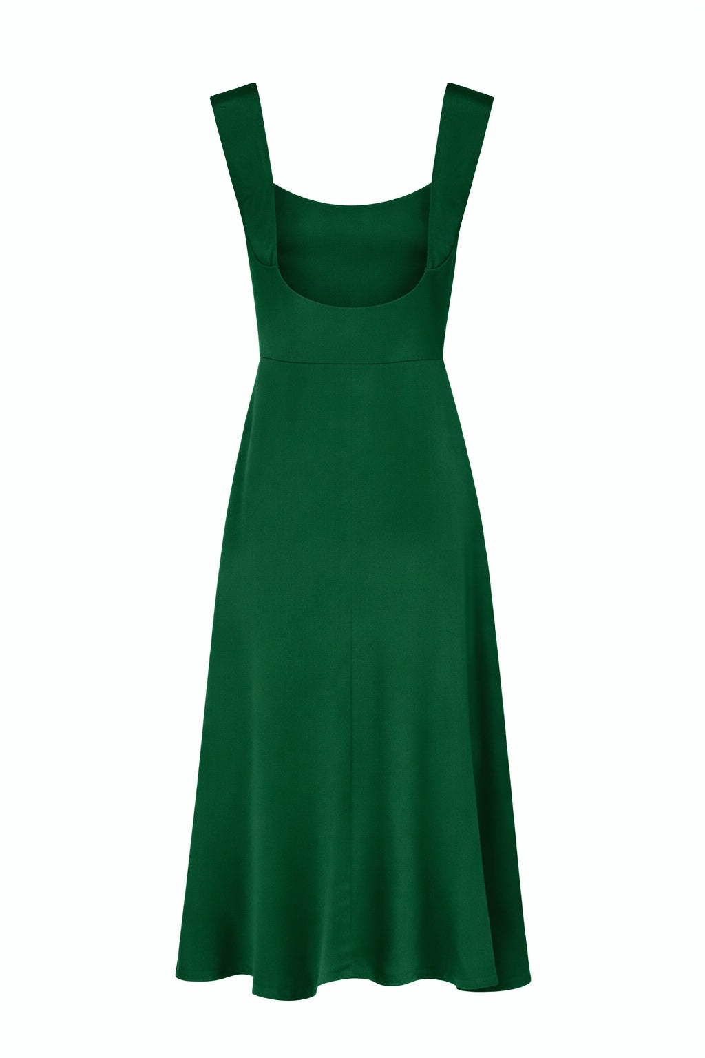 Crafted from upcycled Heavy Luxe Matte silk, this dress offers a luxurious stretch for comfort. Its design highlights a square neckline, with a fitted bodice and waist that gracefully transitions into a full skirt.