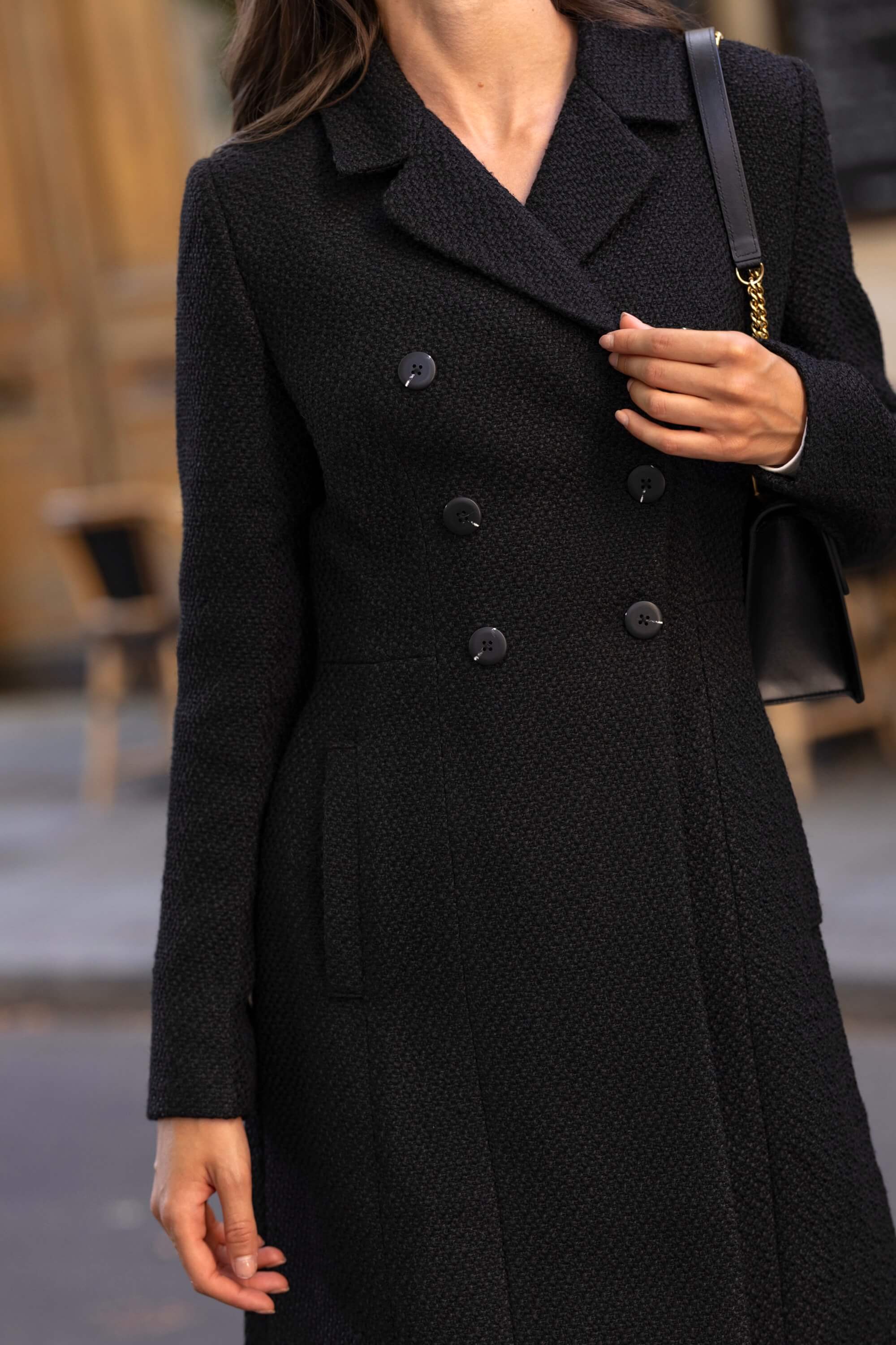 This coat is crafted from the finest upcycled wool tweed and fully lined. It features a double-breasted front, a notched collar, and a midi length. The waist is subtly defined, with a triangular-shaped skirt, and welt pockets are integrated into the reliefs.