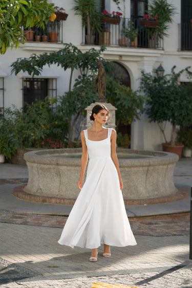 Created from premium upcycled triacetate, this dress features a square neckline framed by folded straps, a tailored waist, and a full skirt with a graceful overlay. The silhouette is completed with an open back and a concealed side zipper for a seamless finish.