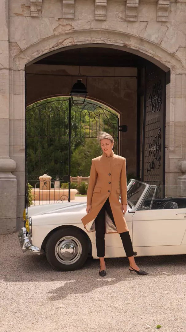 This coat is created from durable upcycled wool with a structured silhouette inspired by menswear tailoring. Fully lined, it features a single-breasted front, clean closure, and integrated pockets for utility